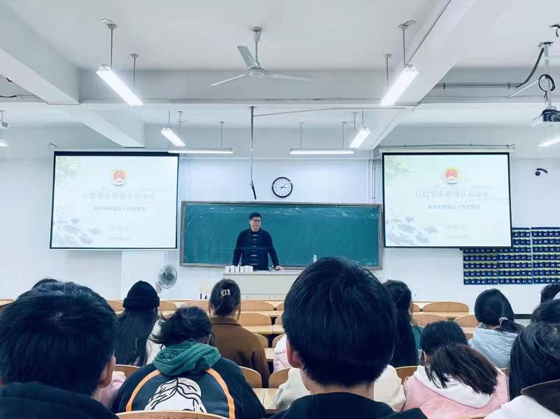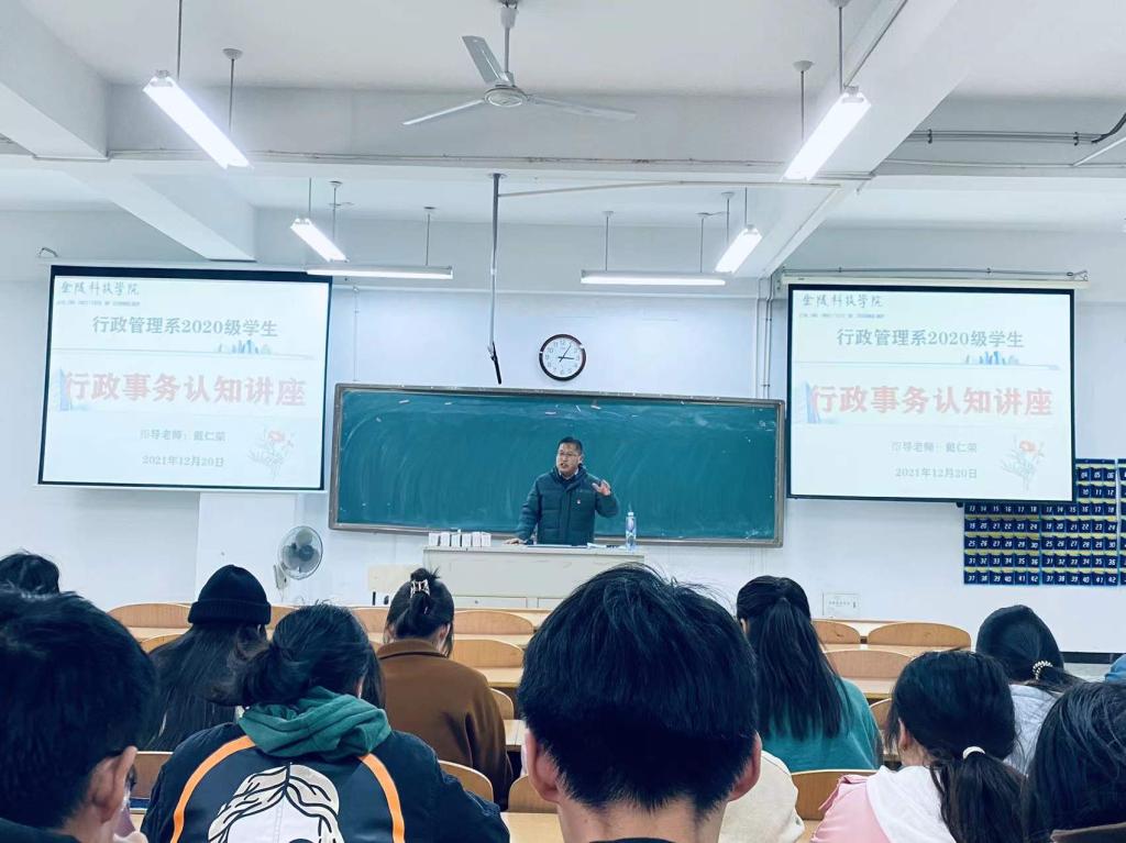 为行政管理专业学生深入了解和掌握行政管理的基本理念和实务操作技能,金陵科技学院行政管理系于2021年12月20日15:00在幕府校区图教楼B205教室,面向行政管理系2020级学生开展了一场理论与实务有机融合的行政事务认知讲座。金陵科技学院行政管理系主任戴仁荣副教授、南京市秦淮区人民检察院办公室主任刘似玉检察官为此次讲座的联合主讲人,2020级行政管理系全体学生有幸聆听了此次讲座。
