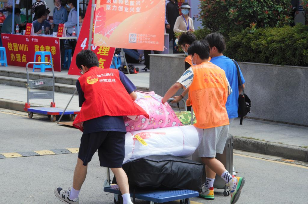 在学院迎新点,人头攒动。校园里随处可见身着橙色马甲的人文志愿者身影,引导测温做核酸,帮助新生搬运行李,指引校园宿舍路线,用热情的行动感染着莘莘学子,传递着人文关怀。现场,学院特别为新同学们准备了一份丰富贴心的新生礼包:印有“以文育人,守正创新”的玉兰花文件袋和小扇,记录校园美景的明信片,“英国上市公司365欢迎你”的饮用水,温馨提示小卡片,反网络诈骗的宣传单,使初来乍到的新生感受到满满的归属感。为了增进家校沟通,特别制作了新生辅导员班主任联络卡一一发放给新生家长,便于进一步了解在校情况。下午4:00,各班级班主任走进新生宿舍相互认识,增进了解,随后各班级召开了线上主题班会,加强安全纪律教育的主题班会,使新同学们对专业有了基本的认识。