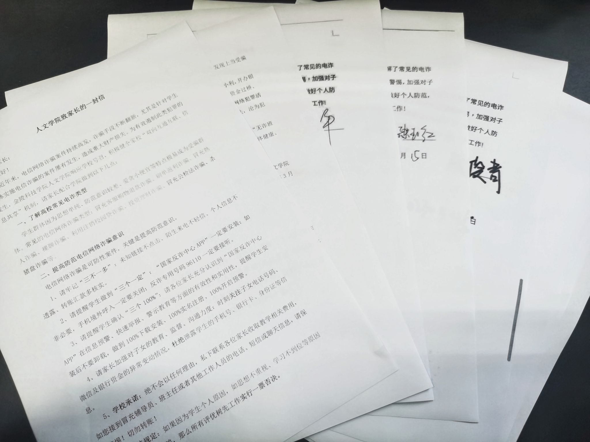 各班级通过线上“邮寄”《防电信网络诈骗宣传告家长书》,提醒家长防范电信网络诈骗,牢记“三不一多”、 做到“三个一定”和“三个100%”,重点要求学生家长加强对子女的教育、监督、沟通力度,及时监管孩子的资金异常状况,时刻关注孩子电话号码,杜绝泄露个人信息。如发现子女在校期间上当受骗,应当迅速保存涉案证据,联系辅导员及相关部门进行处理。家长在收到信件的同时表示,愿意配合学院开展反电诈工作,共同做好预防电信网络诈骗工作。此次学院共收到电子回执单1961份,与发放份数一致。