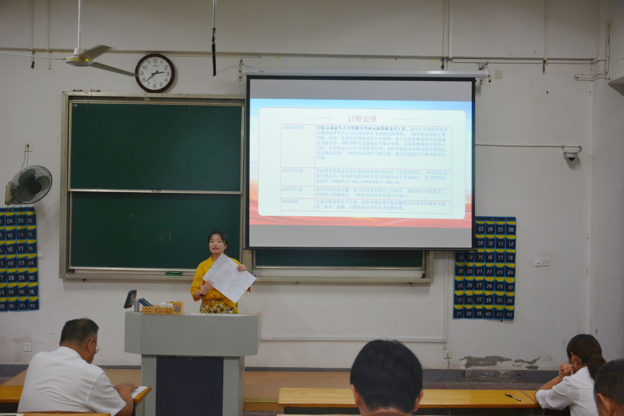 学院高度重视新生入学工作,要求新生各班严格落实相关资格审查措施,不怕繁琐、逐一核实。会议上,要求辅导员、班主任老师要严格按照学校要求将身份证、准考证、毕业证书等原始档案材料与考生本人逐一对照审查,确保准确性、真实性、统一性。随后,学院布置了新生入学资格审查和录取资格复查工作日程安排和存疑信息上报处置办法。