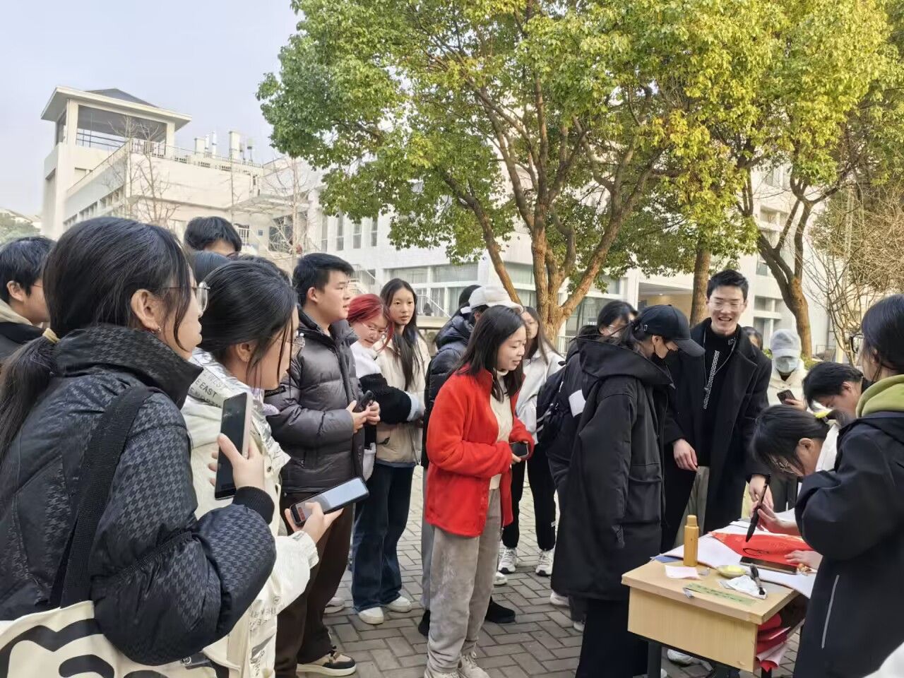 活动前,利用线上“金科人文在线”微信公众号平台,国学社向广大人文学子征集对联内容,得到了同学的积极响应和参与。同学们充分发挥自己的创意,创作出了许多别出心裁的对联,部分同学还对其创作的对联进行了深入的解读和阐释。活动现场,大家通过参与活动可获得国学社书写的对联和“福”字,以及蕴含祝福寓意的书法书签。国学社的同学们挥毫泼墨,创作对联,并将美好祝福悬挂在图书馆前,供大家欣赏品鉴,迎新年和谐、热闹、友爱的氛围弥漫了整个校区。此次活动不仅吸引了广大师生踊跃参与,校园里的工作人员和书法爱好居民也纷纷驻足观赏、称赞。整个活动洋溢着欢声笑语,不仅有效传播了“对联”相关的传统知识,而且传承和弘扬了中华优秀传统文化。