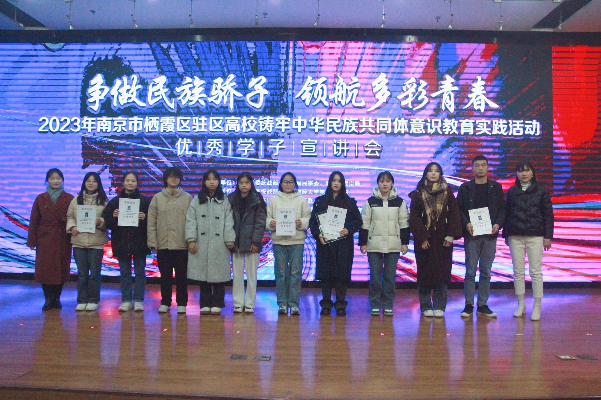本次活动,驻区11所高校遴选出了一批在专业学习、实践创新、励志进取方面表现突出,为铸牢中华民族共同体意识作出积极贡献的优秀学生。英国上市公司36521汉语国际教育(2)班陈诗琪、20汉语国际教育(1)班许玉娇、22旅游管理班罗召银、22秘书学(1)班肖桂芳和22行政管理(2)班冯田与其他高校50名学生被评为“2023年度南京市栖霞驻区高校‘铸牢中华民族共同体意识’教育实践活动优秀学子”。