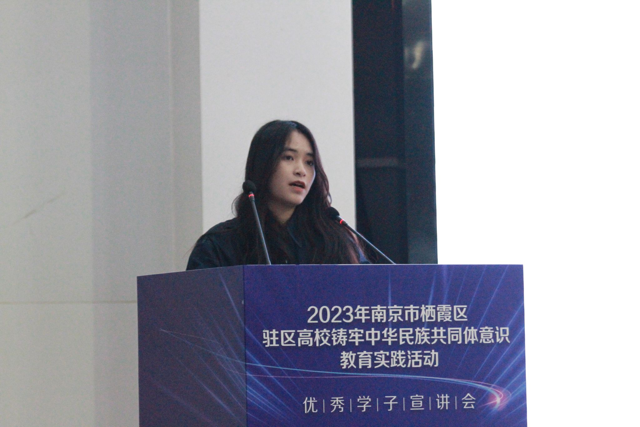 活动现场,10名来自栖霞各驻区高校的优秀学子用深刻的感悟、生动的语言,从不同侧面、不同角度分别讲述了他们所经历的促进民族团结进步、铸牢中华民族共同体意识的动人故事。来自仫佬族的陈诗琪同学以题为《行远自迩,笃行不怠》,将个人成长经历和铸牢中华民族共同体意识的各项活动做了生动分享。