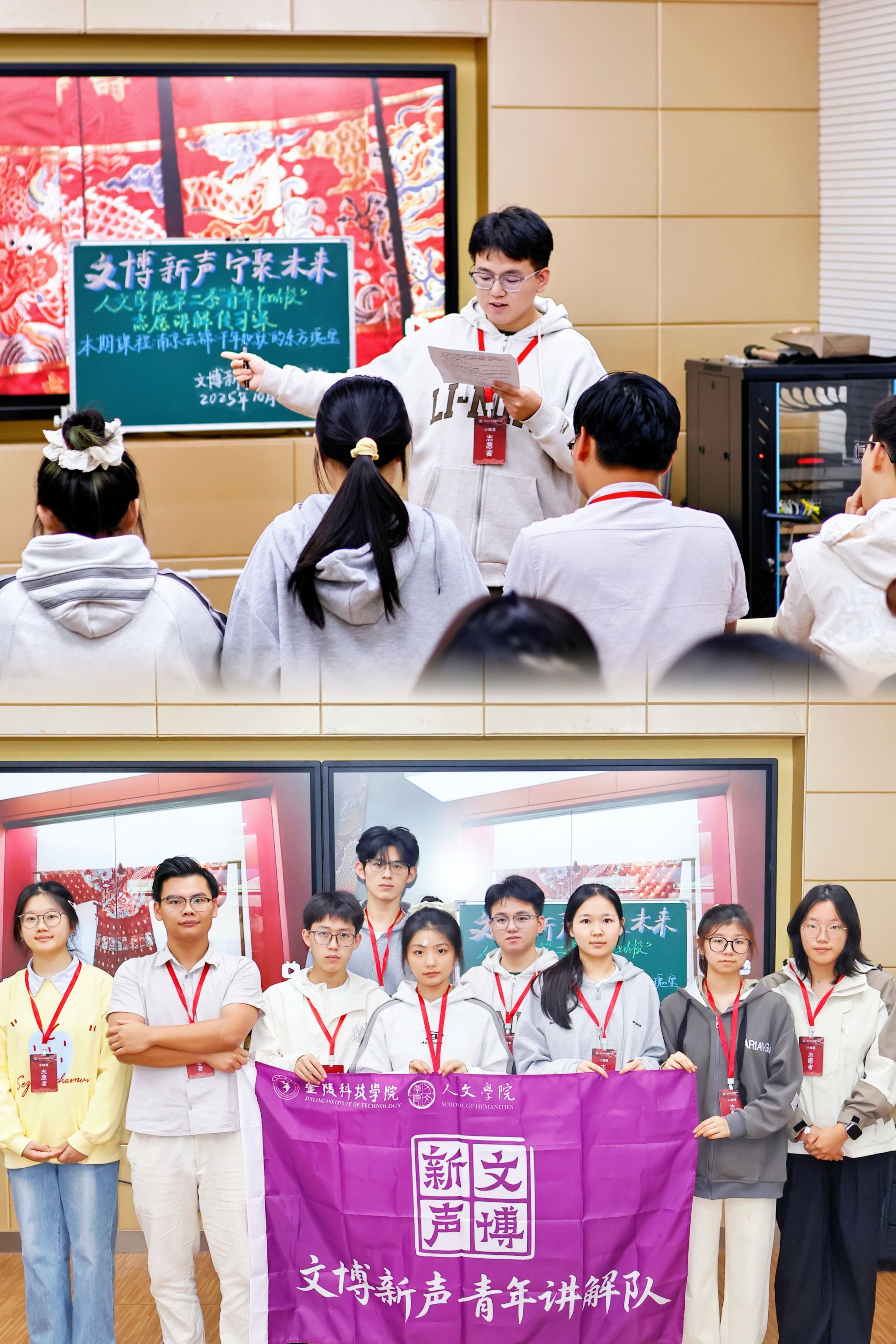2025年全年,志愿队共组织138名志愿者上岗服务,累计服务时长达1700小时。为确保服务质量并实现团队的可持续发展,队伍坚持每学期常态化招新,系统开展多次线下培训,并重点加强了讲解员队伍的建设,创新性地开展了“薪火夜研·英国上市公司365青年Yeah校”志愿讲解传习课程,内容涵盖《南京云锦历史与文化》《南京云锦技艺与美学》等专业知识。在讲解内容打磨上,古典文献学、汉语国际教育等专业学生充分发挥学科优势,依托《江苏手工艺史》《江苏丝绸史》等学术专著对讲解词进行梳理、考证与优化升级,让每一段讲解既保有厚重的历史质感,又具备鲜活的传播张力。